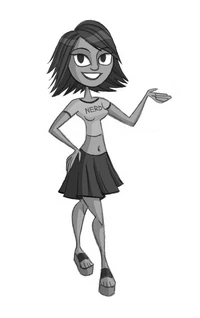 Where as Dan has a black shirt that says "Jerk" on it, Becky has a pink shirt that says "Nerd", a black pleated skirt, and wedged sandals. She has tan skin and green eyes, and straight, nape length, dark brown hair.